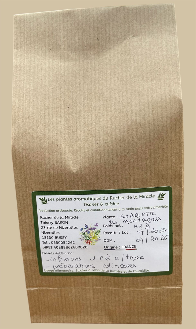 Sarriette des montagnes, une herbe aromatique au parfum intense et légèrement poivrée. Cultivée sur notre propriété en centre France, notre sarriette est récoltée à la main et séchée naturellement pour préserver tous ses arômes dans vos tisanes, infusions, cuisine, herboristerie ... Vous recevrez notre sarriette en sachet kraft de 42 gr net de feuilles et fleurs séchées non traitées, origine France garantie. Cette sarriette est récoltée et conditionnée de manière artisanale comme toutes nos herbes aromatiques. Nous cultivons, récoltons, séchons et conditionnons toutes nos plantes à la main en prenant le temps qu'il faut mais aussi au moment où il faut avec un seul objectif, vous proposer un produit de qualité. Nous n'utilisons aucun produit chimique sur nos plantes. Nous vous souhaitons une bonne dégustation en ne doutant pas que vous aurez autant de plaisir à le consommer que nous en avons eu à vous le préparer.